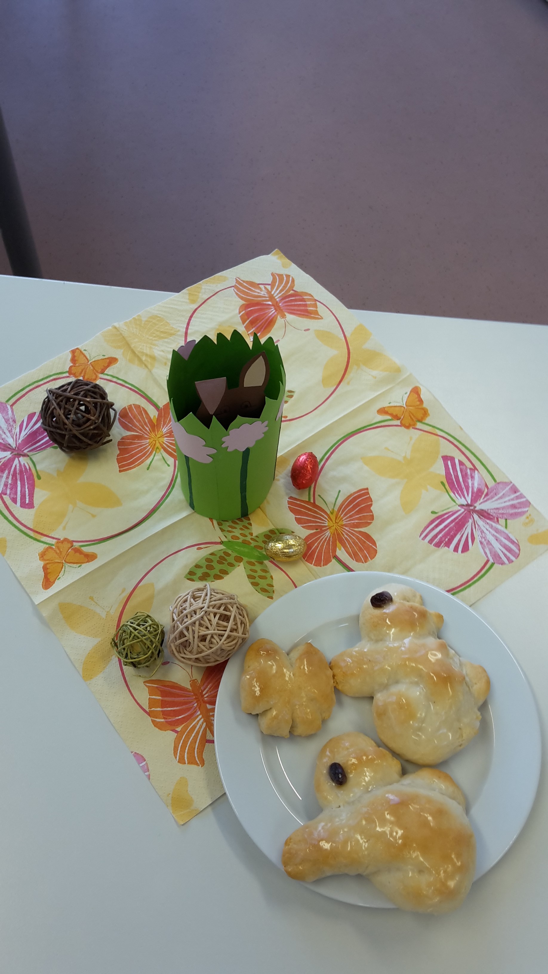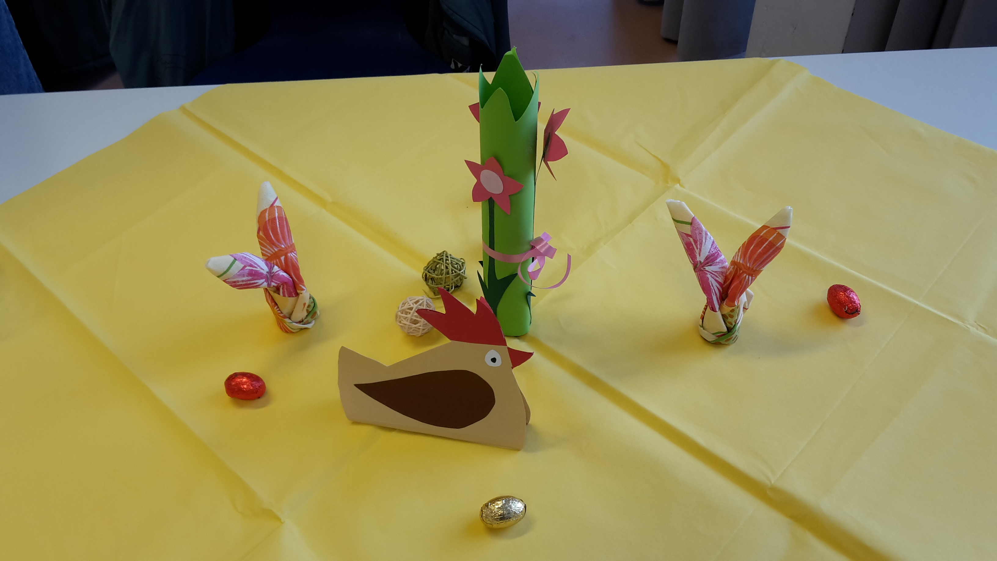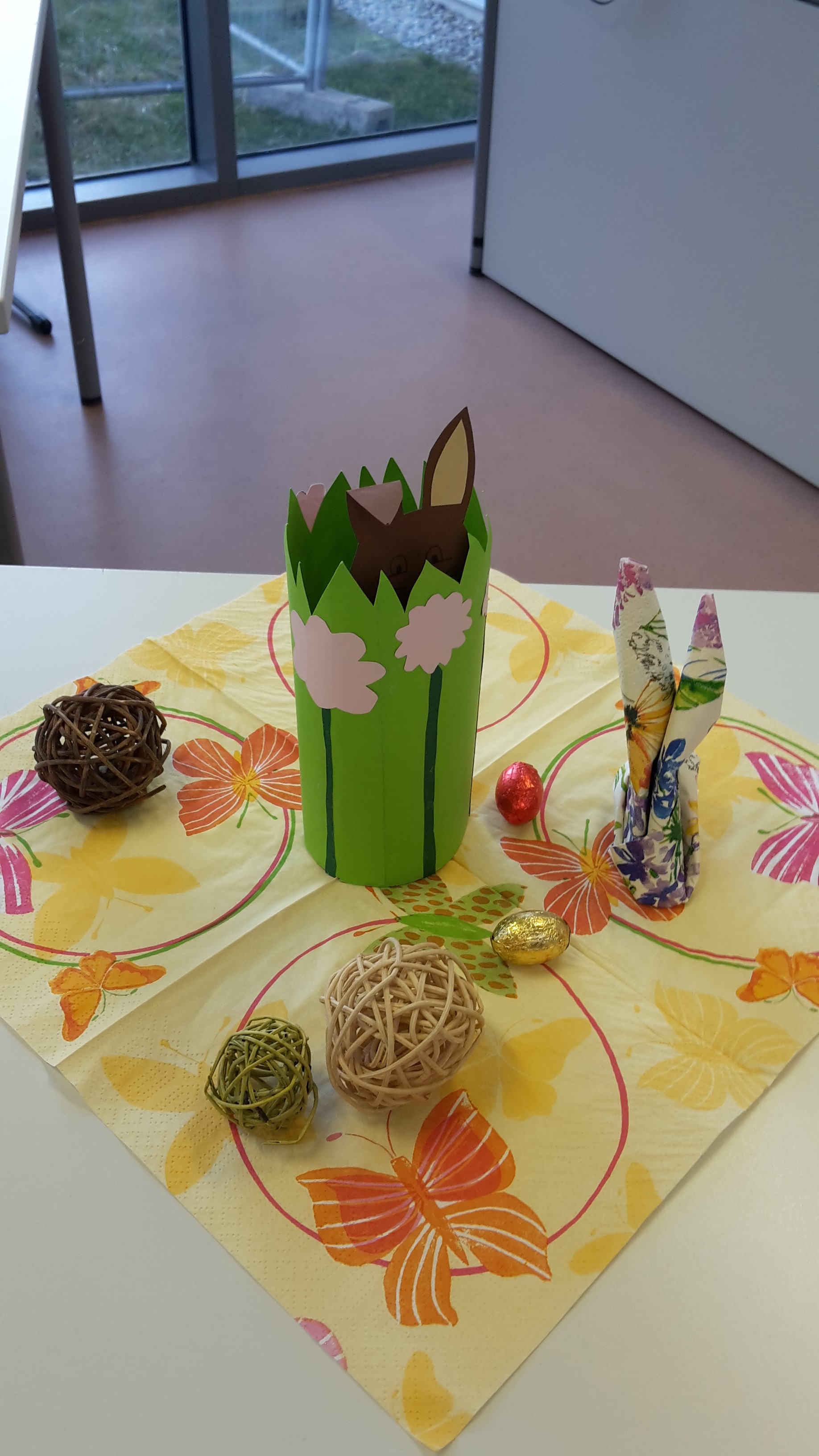 Zur Einstimmung auf die Osterzeit durften die 7. und 8. Klassen Osterhasen aus Quark-Öl-Teig backen. Zudem haben die Schüler den Tisch passend zum Thema Frühling/Ostern dekoriert.