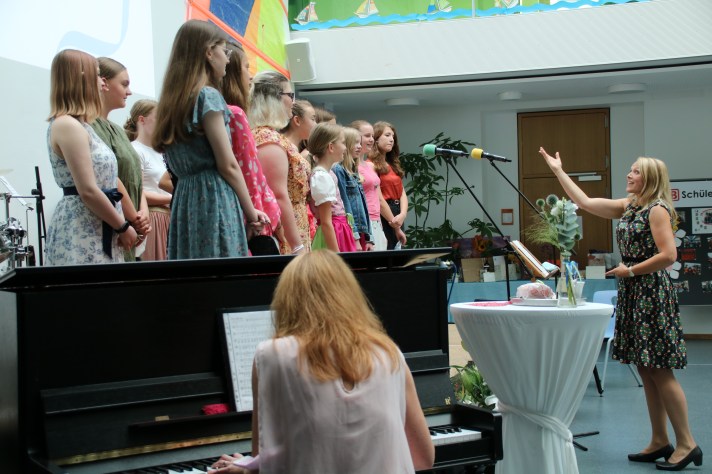 So gab es viele musikalische Beiträge wie das Stück „Nun geht die Chefin, die ihr alle liebt“ der Chorklasse 5B, ein Musikvideo mit dem Titel „Niemals geht man so ganz“ des Elternbeirats, das Stück „So oder so ist das Leben“ von Musiklehrerin Martina Appel-Schwab sowie das selbst gedichtete Lied „Zukunft ist jetzt“ dreier Schüler in Begleitung des Chors.