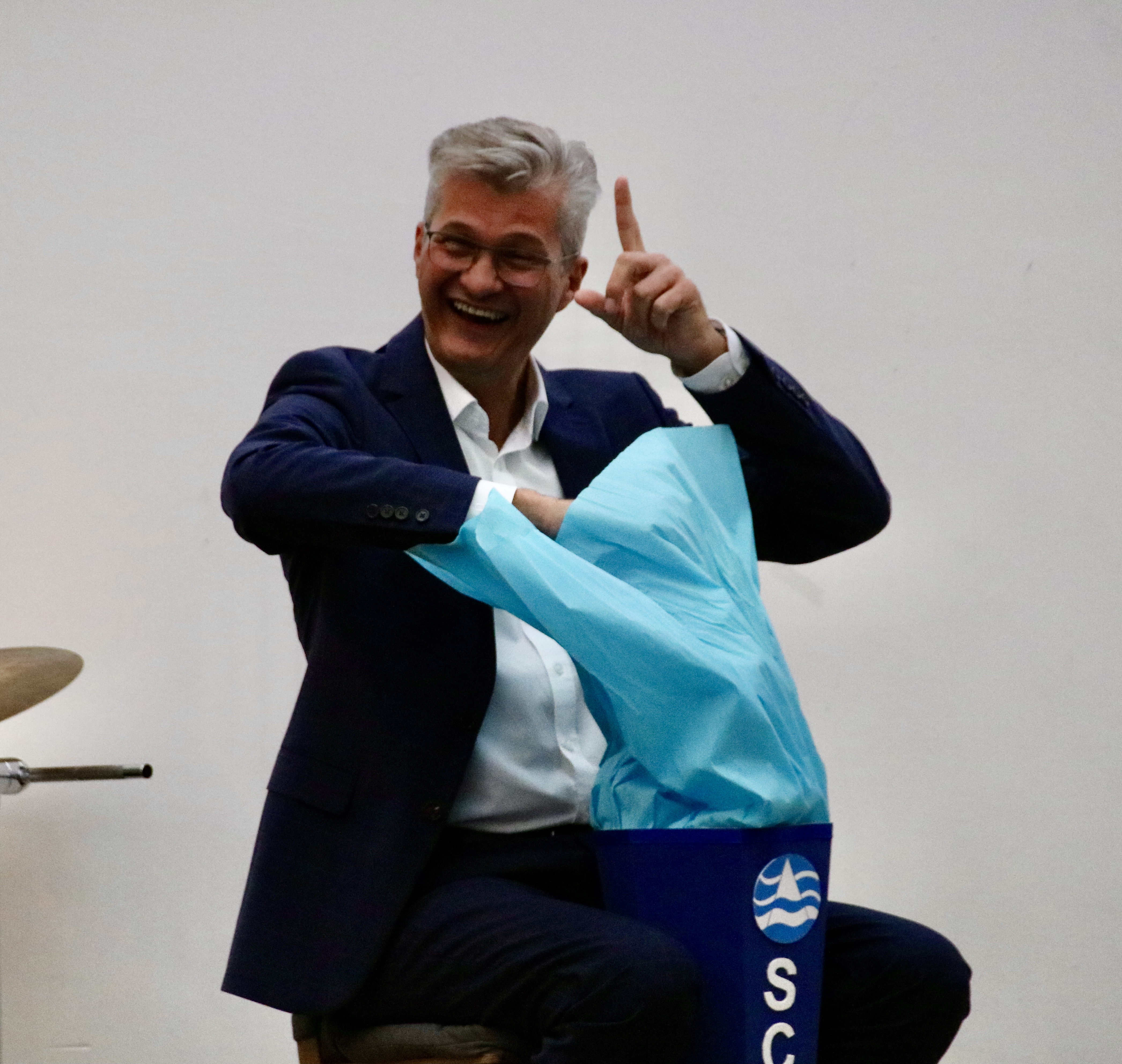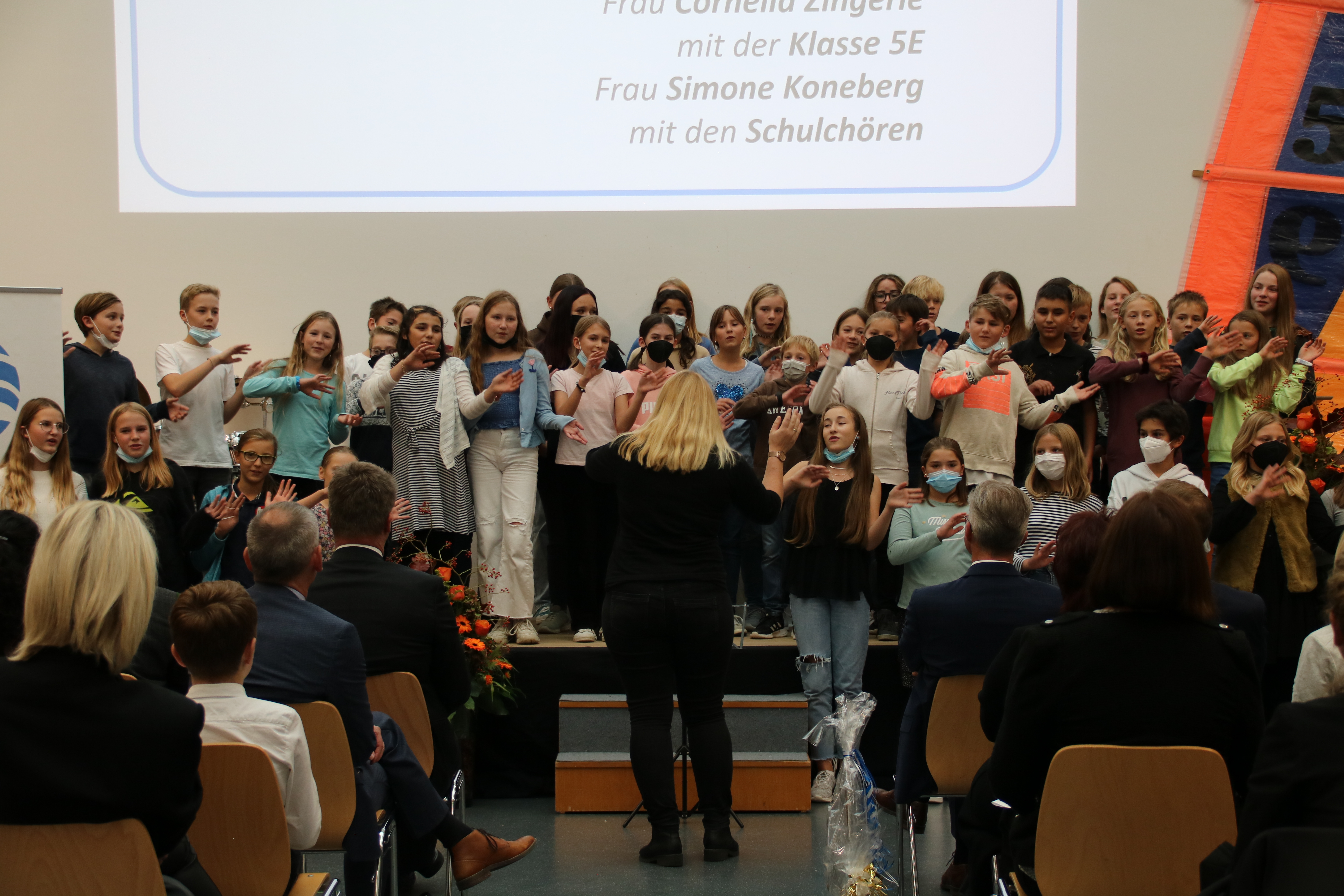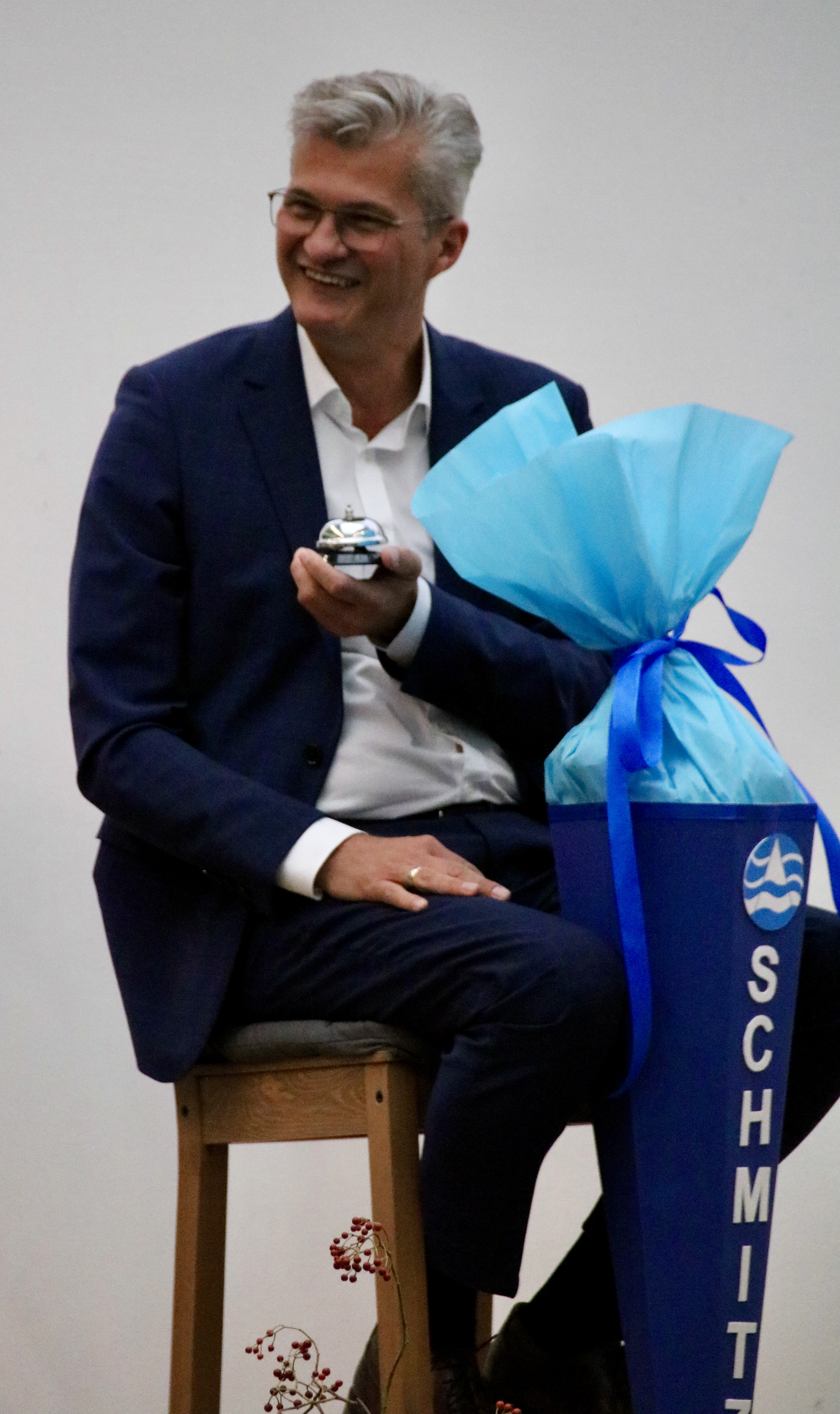 Ebenfalls sehr herzlich war der Auftritt der SchülervertreterInnen, die auf der Bühne gemeinsam mit ihrem neuen Schulleiter eine Schultüte mit einigen persönlichen Geschenken füllten und durch Anspielungen für viele Lacher im Publikum sorgten. So überreichten sie beispielsweise ein Hausaufgabenheft, in dem Christian Schmitz seine frühmorgendlichen Rudereinheiten dokumentieren solle. Dieses werde hin und wieder kontrolliert und wenn es etwas zu bemängeln gebe, „dann müssen auch mal die Eltern kontaktiert werden“, meinte die Schülersprecherin Marie Müer augenzwinkernd und lächelte in Richtung der Eltern Schmitz, die in der ersten Reihe saßen – ebenso wie sein Ehemann Andreas.