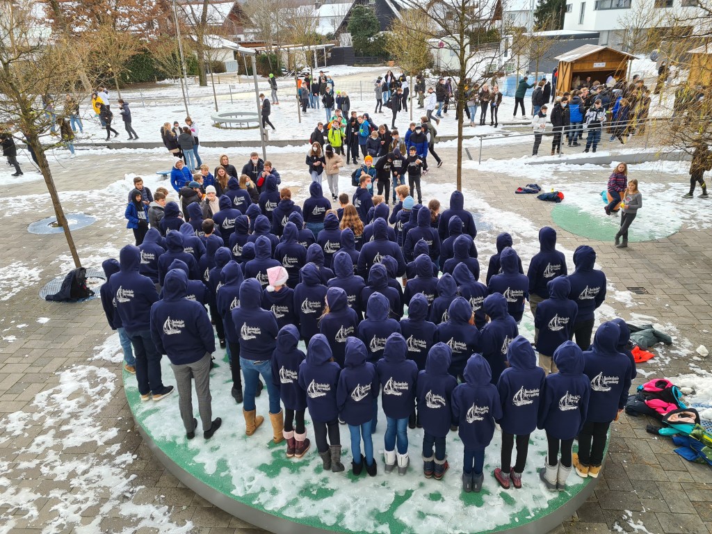Die Schulfamilie der Staatlichen Realschule Herrsching freut sich sehr über die neuen Schulpullover, die über die SMV erhältlich sind. Die blauen Hoodys zeigen vorne das Schullogo und hinten ein Bild eines Schiffes – gezeichnet von einer Schülerin.