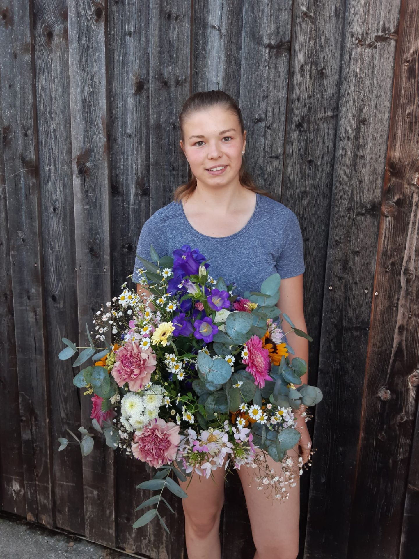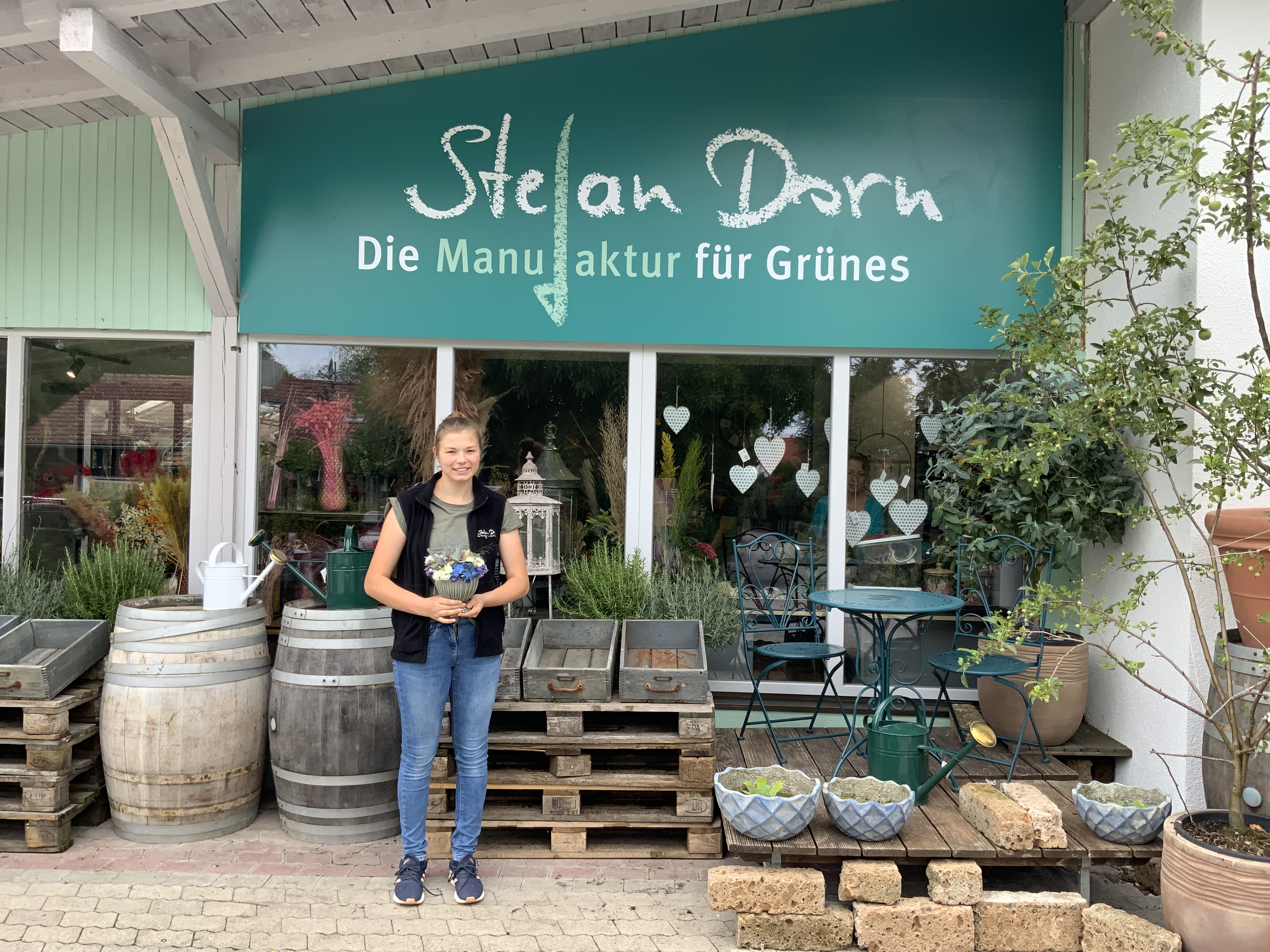 Bild 6: Lena mit selbstgebundenem Blumenstrauß würde gleich direkt übernommen werden in der Floristikabteilung der Gärtnerei Dorn in Andechs