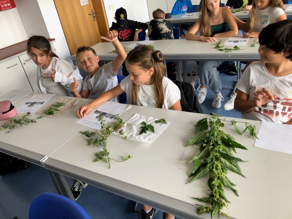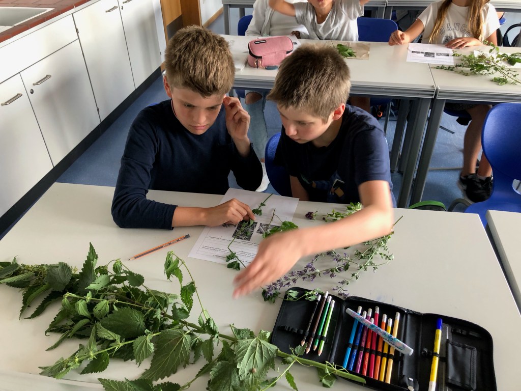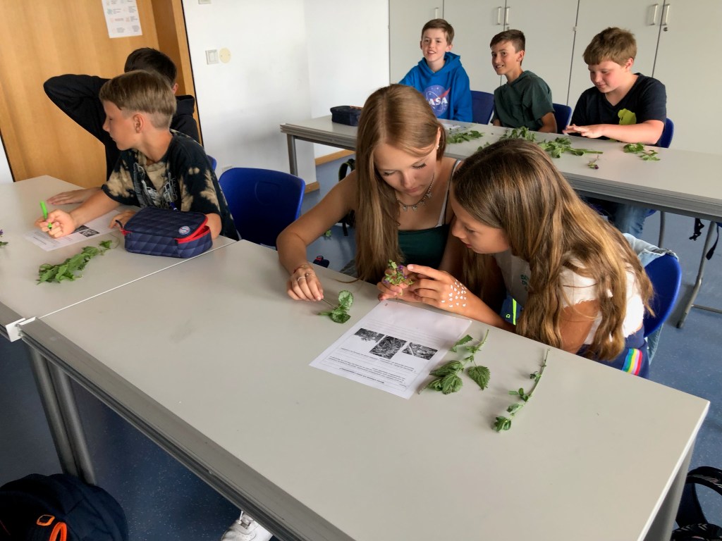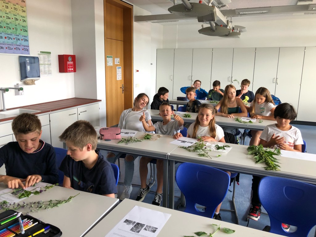 In einer Zaubertrankstunde müssen für den Trank einige Zutaten gemischt werden. Die Flüssigkeit im Kolben blubbert: erst grün – dann blau – rot und zuletzt ist sie gelb. Die letzte rätselhafte Zutat: Salbei. Doch woran erkennt man diese Pflanze? Der einzige Tipp: Salbei ist ein Lippenblütler! Die Schüler der 5C sollen durch Vergleichen verschiedener Lippenblütler von Salbei über Braunellen bis hin zu Taub-, Bunt-und sogar Brennnesseln die Kennzeichen eines Lippenblütlers erarbeiten.