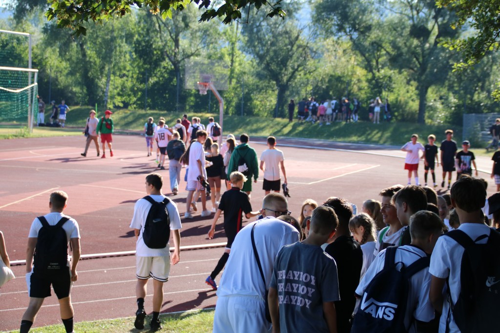 Alle 5. und 6. Klassen durften an einem Völkerballturnier teilnehmen. Für die 7. bis 9. Klassen gab es ein Fußballturnier. Unter strahlend blauem Himmel und sommerlichen Temperaturen konnte unser Turnier dann tatsächlich nach 3 Jahren Pause endlich wieder starten. Alle SchülerInnen erschienen in Sportkleidung und mit genügend Getränken bewaffnet um 7:55 Uhr im Klassenzimmer.