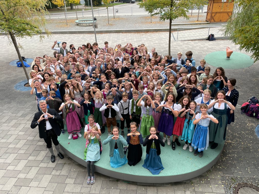 Auch wenn die Sonne nicht vom weiß-blauen Himmel schien – Schulleitung, Lehrkräfte und SchülerInnen strahlten beim Foto in ihrer feschen Tracht.