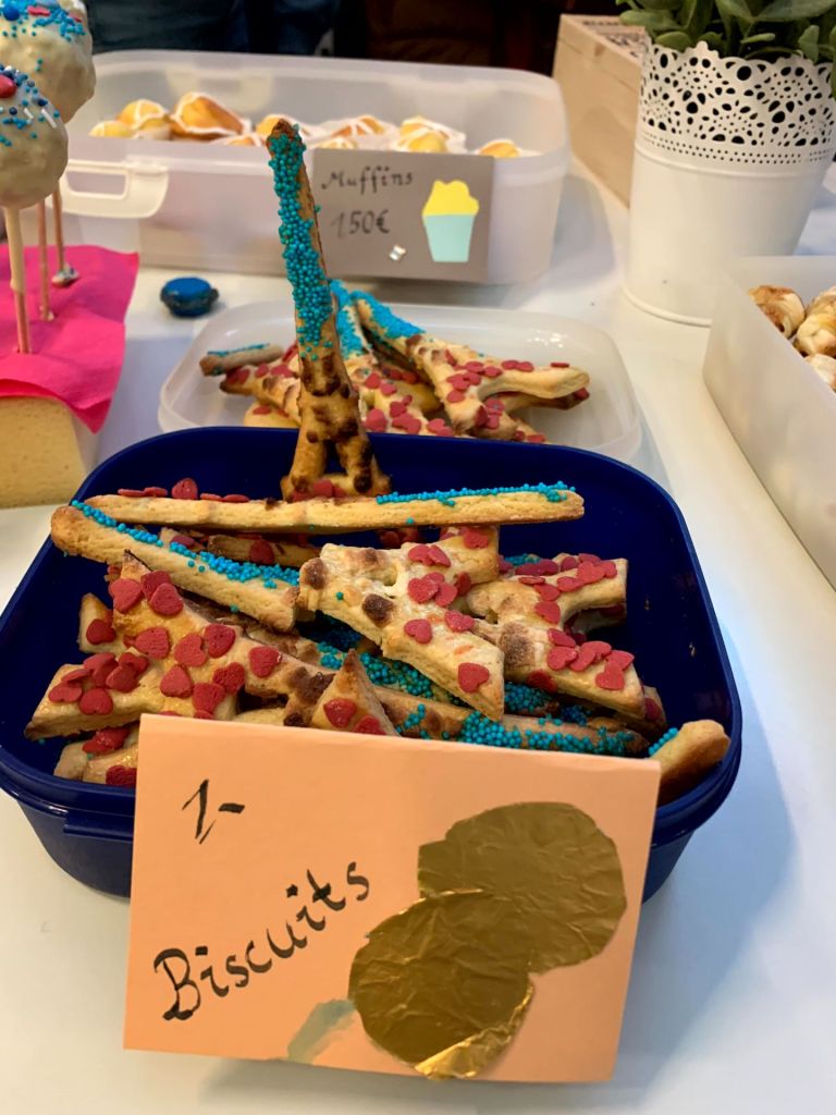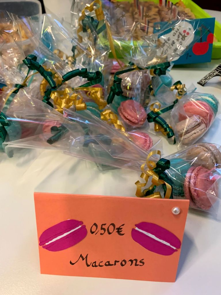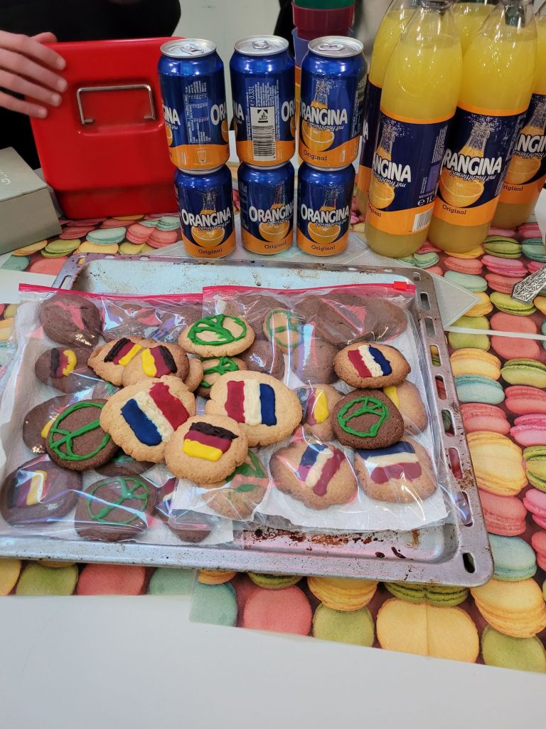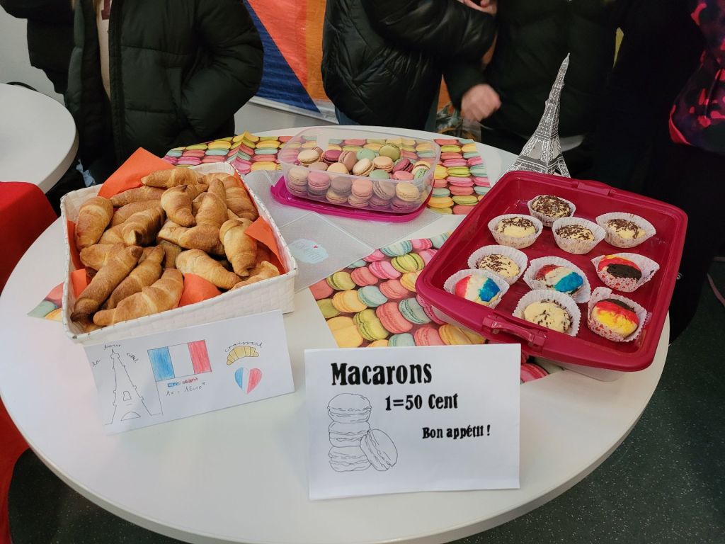 Die FranzösischschülerInnen der Klassen 7 C und 7 D verwöhnten uns in beiden Pausen mit ihren liebevoll dekorierten französischen Leckereien im Atrium. Zeitgleich lief dort eine Präsentation, welche die Klasse 8 E zu Sehenswürdigkeiten, Essen, Musik, Sport und Mode in Frankreich erarbeitet hatte, und zu der im Anschluss ein Quiz beantwortet werden konnte. Wer alle zehn Fragen lösen konnte, erhielt den Code 321: Damit konnte zum einen das Zahlenschloss geöffnet werden und somit auch die Carambars, bei denen sich auf der Innenseite ein französischer Witz versteckt. Zum anderen steht die Zahl für die 321 Millionen weltweit französischsprechenden Menschen – und damit sind all jene, die Französisch als Fremdsprache lernen, nicht mit eingerechnet.