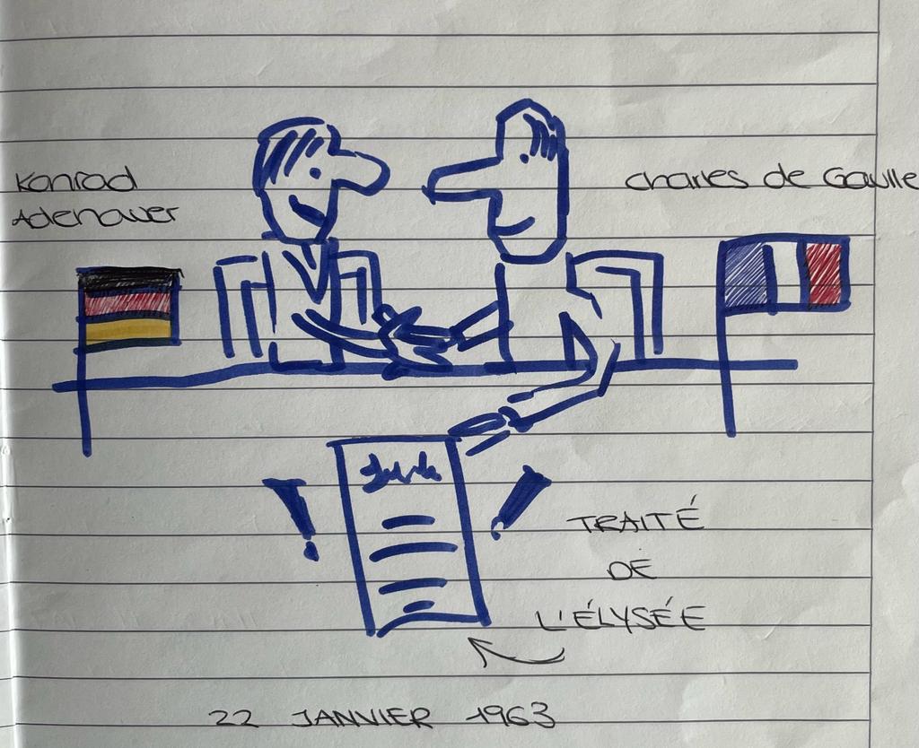 «France et Allemagne – Unies pour la paix » – unter diesem Motto steht der 60. Jahrestag des Élysée-Vertrags, der am 22. Januar 1963 von Konrad Adenauer und Charles de Gaulle unterzeichnet wurde (siehe Hefteinträge von Charlotte Birner und Paula Pejnović) und bis heute die deutsch-französische Partnerschaft besiegelt und der Grundpfeiler der Friedenssicherung ist. Diese Verbundenheit zwischen den beiden Nachbarländern, die nunmehr seit mehr als sechs Jahrzehnten in Frieden miteinander leben, gilt es zu pflegen, zu fördern und auszubauen – gerade jetzt, da Krieg in Europa herrscht.