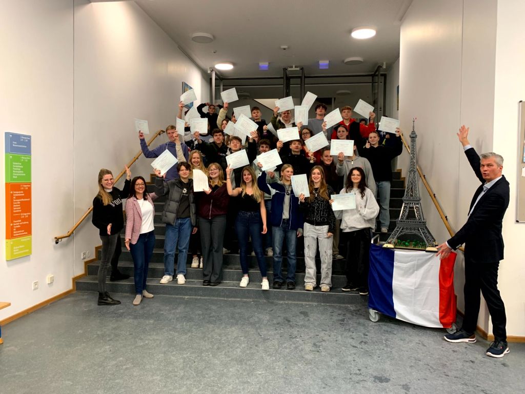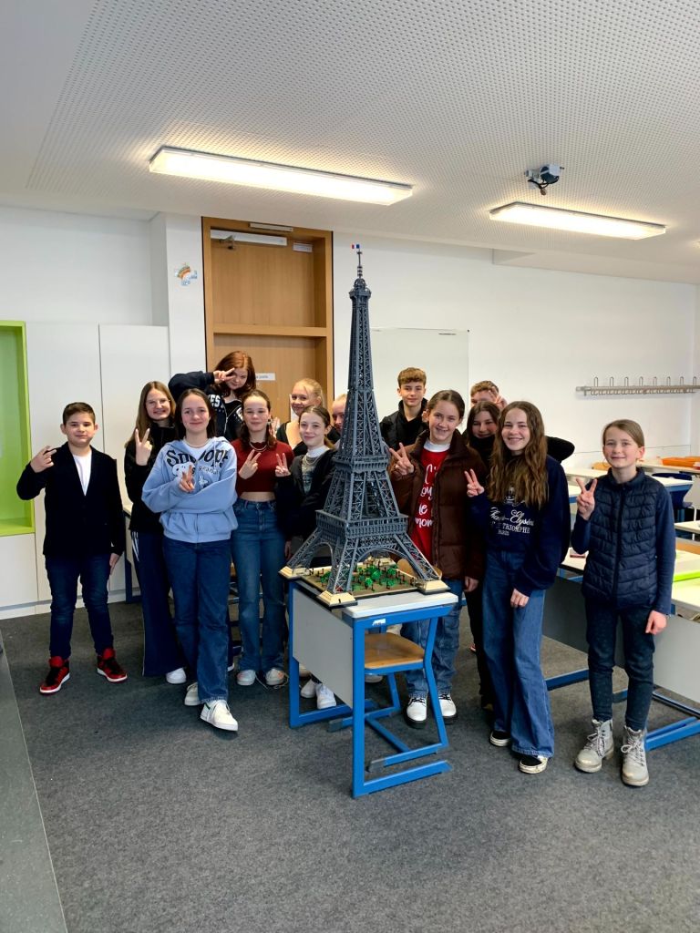 Wie beispielsweise unsere jetzigen AbschlussschülerInnen des Französischzweigs, die an diesem Tag ihr DELF A 2 Diplom überreicht bekamen. Herzlichen Glückwunsch zu diesem Sprachdiplom! Denn Sprache ist der Schlüssel zur gegenseitigen Verständigung. So gerne hätten unseren letztjährigen NeuntklässlerInnen ihr sprachliches Können in Frankreich unter Beweis gestellt. Leider blieb ihnen diese Studienfahrt pandemiebedingt verwehrt. Umso größer war die Freude, als das Symbol der französischen Hauptstadt aus Lego und mit einer Größe von 1,50 Meter vor ihnen stand: der Eiffelturm und so wehte durch zahlreiche Aktionen an diesem Tag ein Hauch Frankreichs durch das ganze Schulhaus.