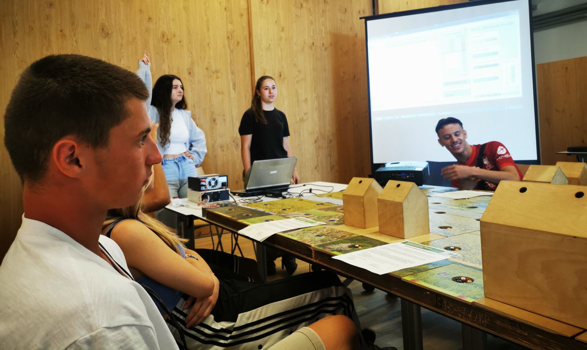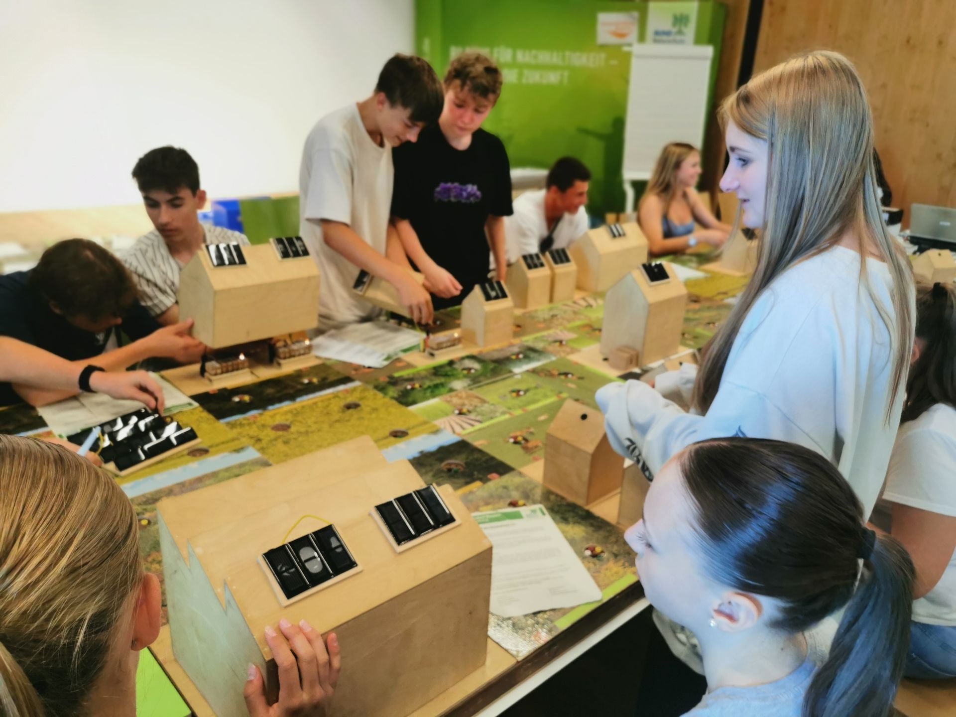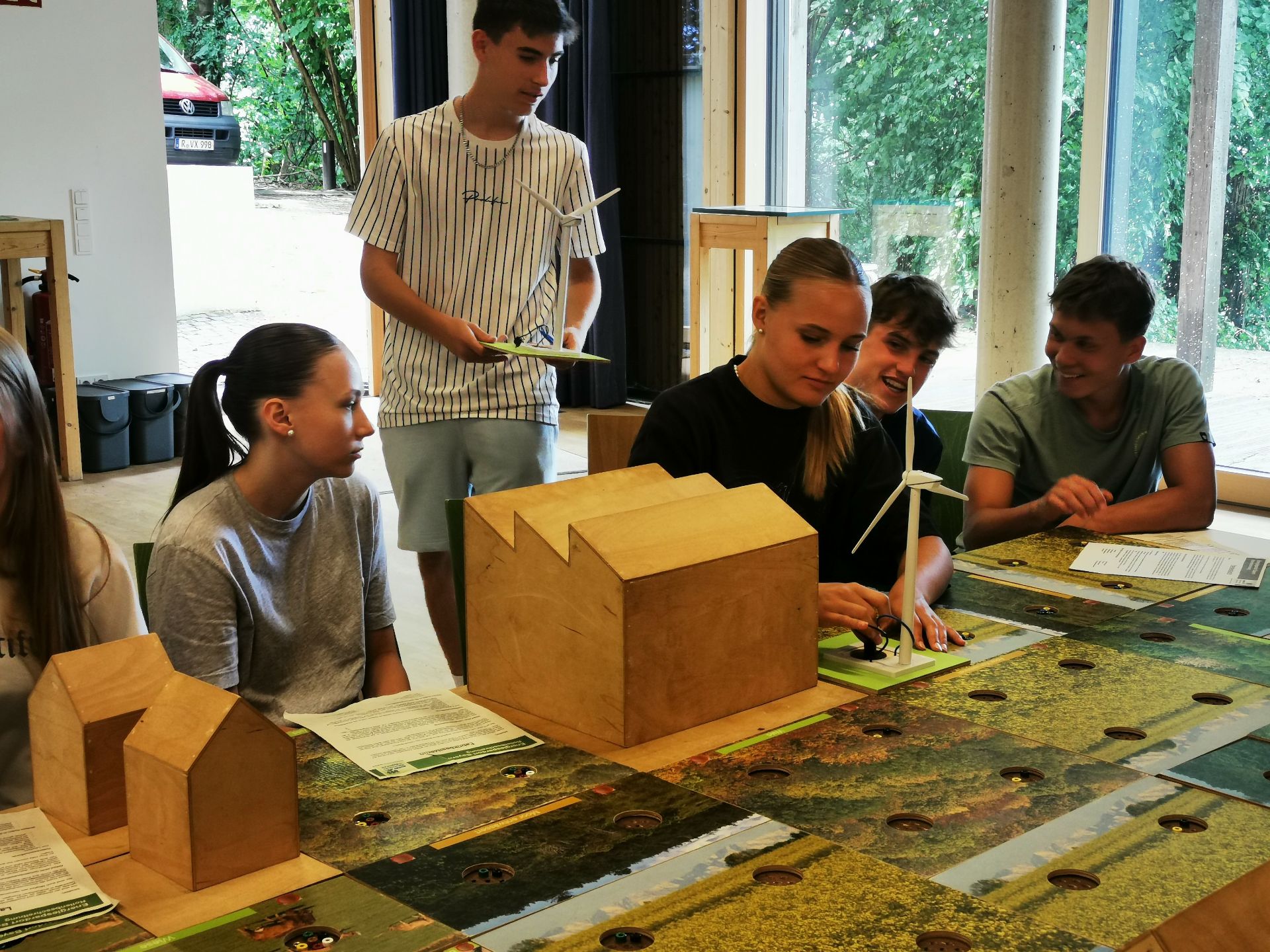 Die Schüler versammelten sich um den Tisch, der mit Modell-Häusern mit Niederspannung aufgebaut war und ordneten Energieverbraucher wie z.B. Spülmaschine, Heizung usw. den jeweiligen Häusern und Fabriken zu. Anhand einer Statistik konnte dargestellt werden, wie viel Stromverbrauch, CO2 Ausstöße und der allgemeine Energieverbrauch sich pro Jahr im Dorf zusammensetzt.