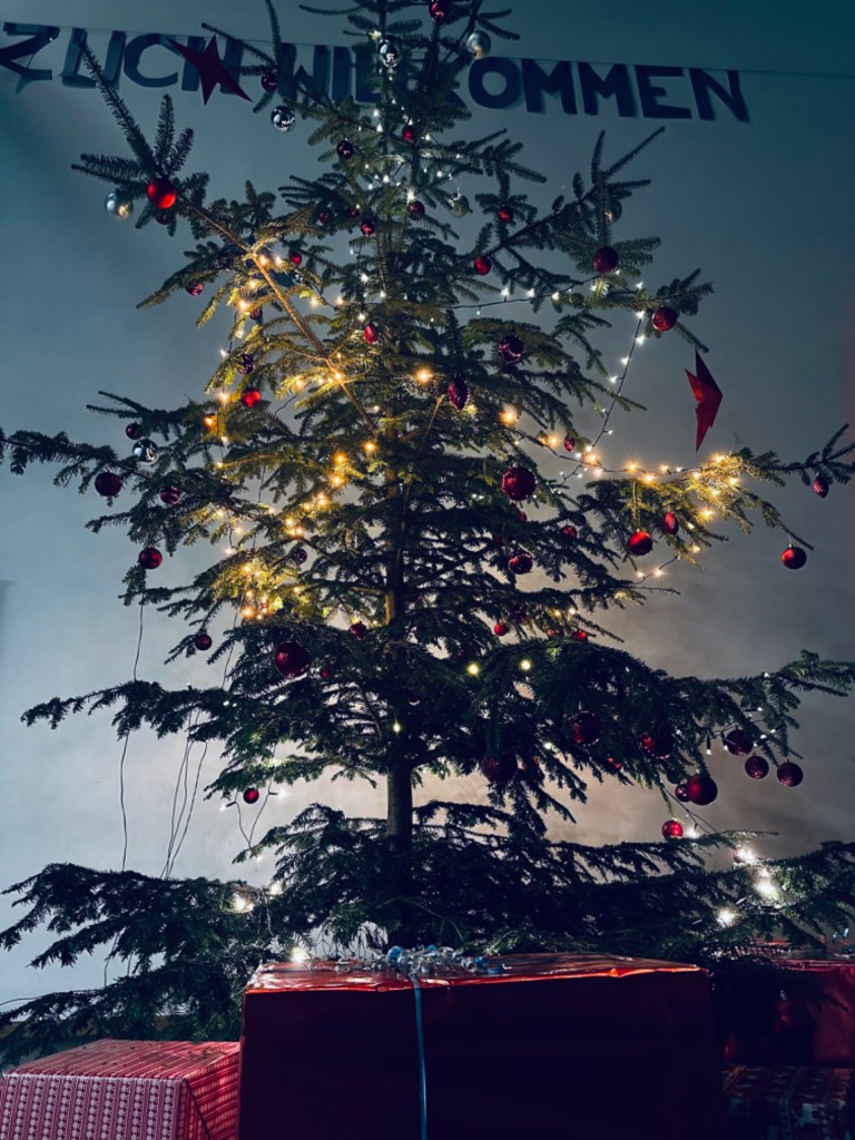 Ein herzlicher Dank gilt unseren Hausmeistern und Schülersprechern, die den Baum mit viel Hingabe, Lichterkettenentwirrungskompetenzen und gestalterischen Fähigkeiten geschmückt haben.