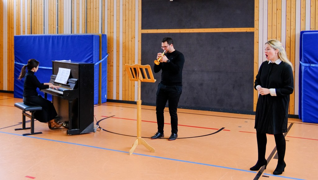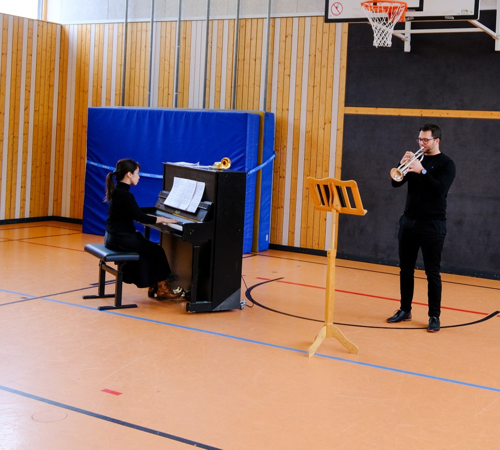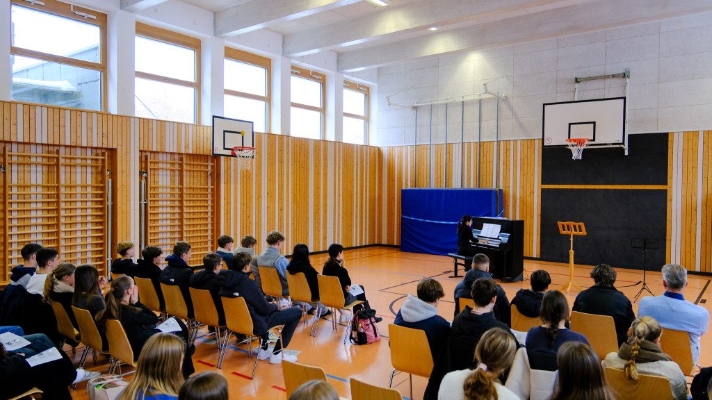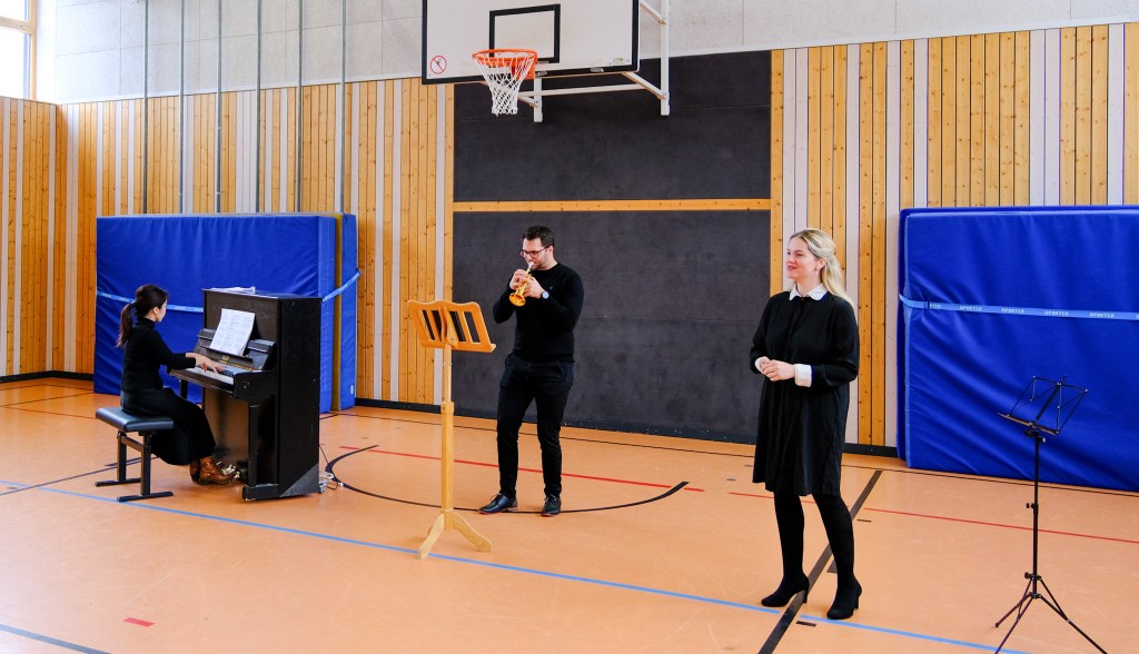 Am 8. Dezember 2023 fanden an der RSH zwei Konzerte im Rahmen von „Musik für Schüler“ statt. Die mitwirkenden Künstlerinnen und Künstler waren diesmal Teresa Boning (Sopran), Rie Kimura (Klavier) und Georg Hiemer (Trompete). Um 10.00 Uhr erklang das erste Konzert für die Klassen 9cd,f und um 11.00 Uhr das zweite Konzert für die Klassen 8a,c. Professionell wie immer wurden Musikstücke unterschiedlicher Epochen dargeboten. Die Schülerinnen und Schüler hörten unter anderem „Die Forelle“ von Franz Schubert und den „Chinesischen Tanz“ aus dem Ballett „Der Nussknacker“ von Peter Tschaikowsky. Bei „All of me“ von John Legend, vorgetragen von der Trompete, summten einige Schülerinnen und Schüler spontan mit. Nach den Konzerten hatten die Schülerinnen und Schüler die Möglichkeit Fragen zu stellen. Es ist eine Freude, mit wie viel Sympathie und Offenheit die Künstlerinnen und Künstler jungen Menschen begegnen!