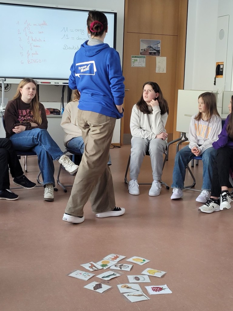 Auf authentische und spielerische Art und Weise brachte die 23-jährige Französin Johane Siro, die für mehrere Monate in München lebt und für das institut français arbeitet, den Schülern und Schülerinnen der Klassen 6 A, C, D und E in jeweils einer Unterrichtsstunde die französische Sprache näher. So lernten die Sechstklässler schnell über ihren Namen, ihr Alter, ihren Wohnort, ihre Hobbys und ihre Sprachkenntnisse in der neuen Fremdsprache Auskunft zu geben. Auch aktuelle französische Musik floss spielerisch anhand eines Zahlenspiels mit ein.