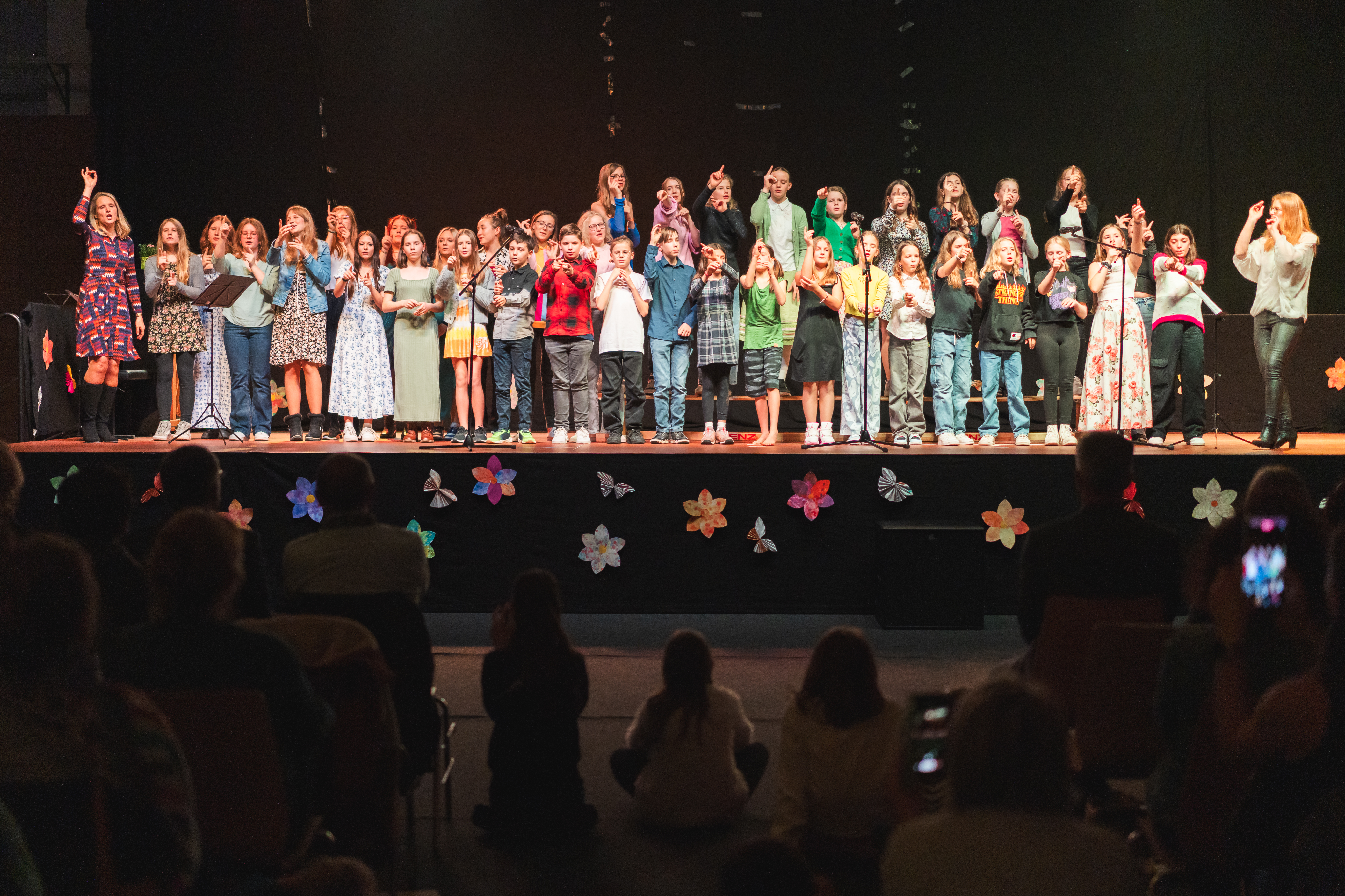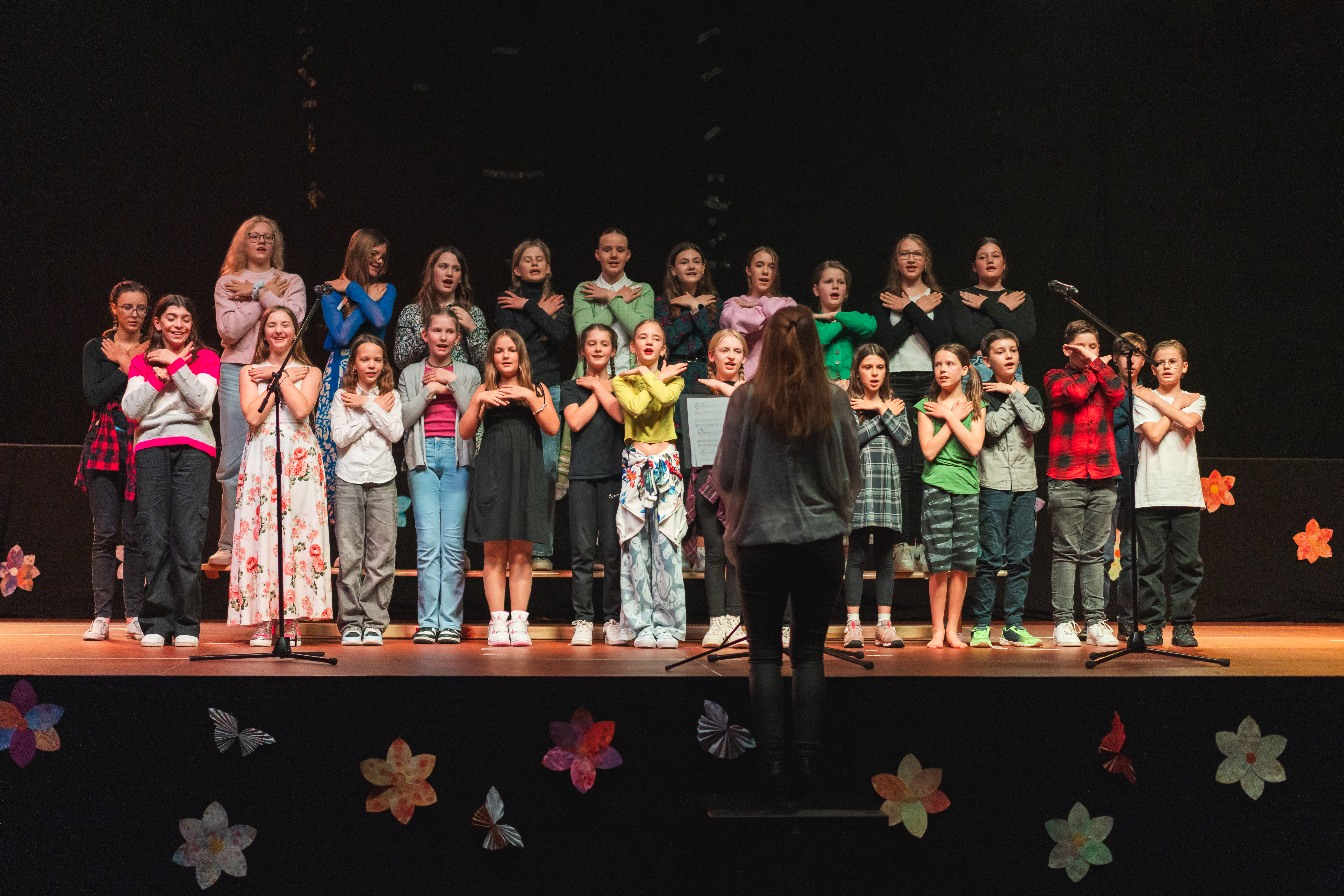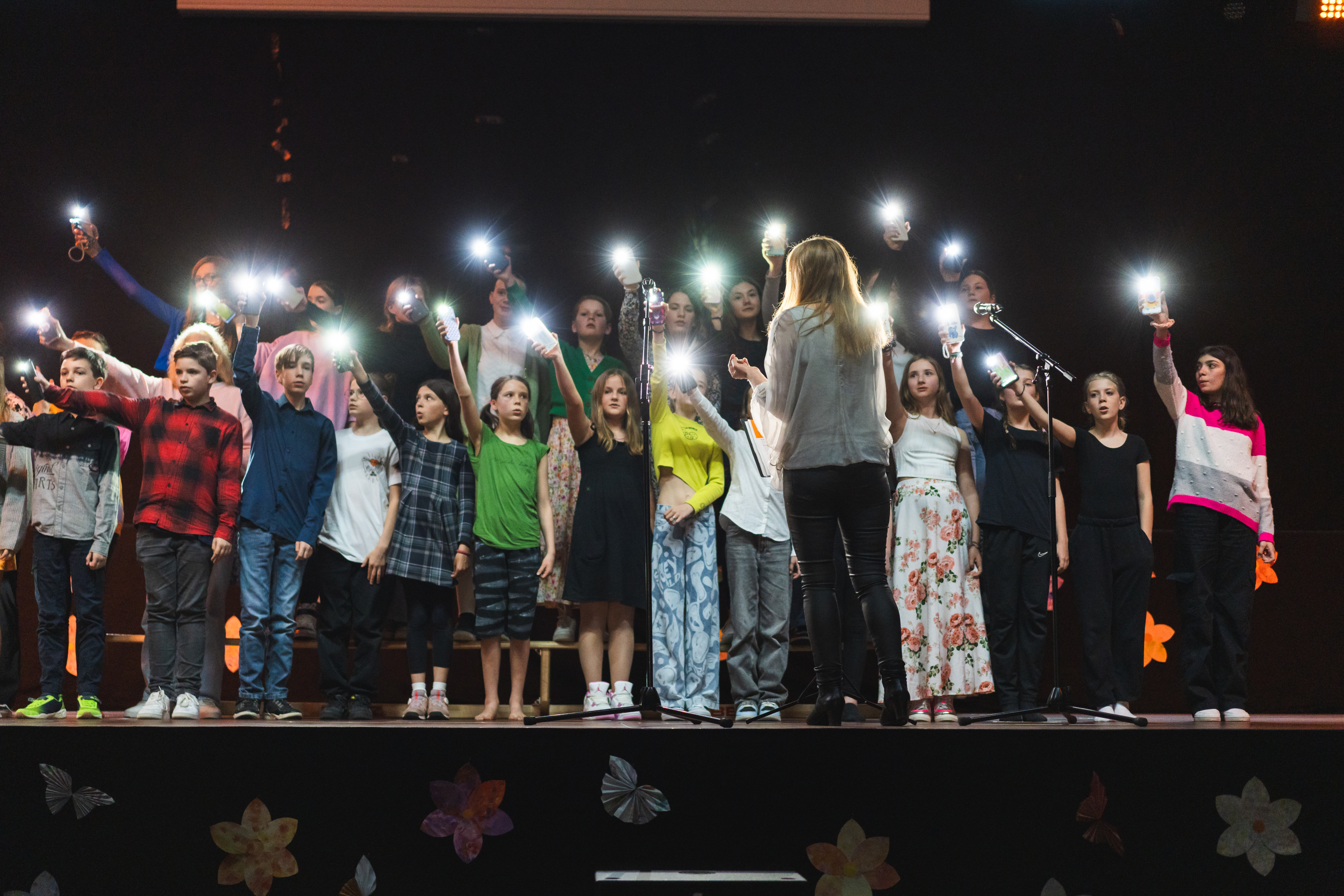 Junge Akrobaten und Bewegungskünstlerinnen zeigten auf der mit Schmetterlingen und Blumen bunt dekorierten, riesigen Bühne ihr Geschick und bewiesen zudem schauspielerisches Können. Im Sinne des Schulmottos „Treat people with kindness“ spielten sie vor, wie wichtig es ist, sich gegenseitig zu helfen, um die Balance zu halten.