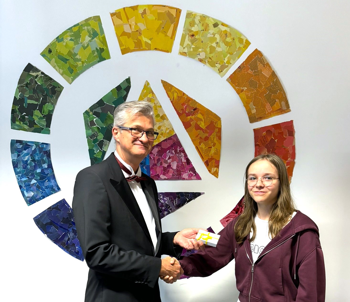 Das Deckblatt für das nächste Hausaufgabenheft 2024/25 steht fest! Spiegl Sophia, Klasse 9 a, überzeugte mit einer überwältigenden Mehrheit die Klassesprecherversammlung von ihrem Entwurf. Herr Schmitz überreicht ihr den Siegerpreis und bedankt sich für die zahlreichen kreativen Einsendungen.