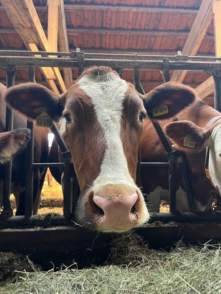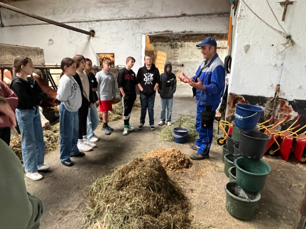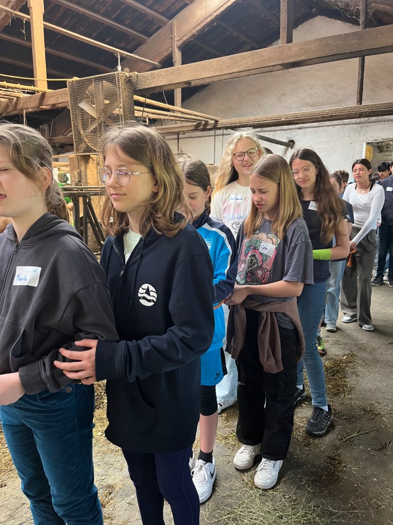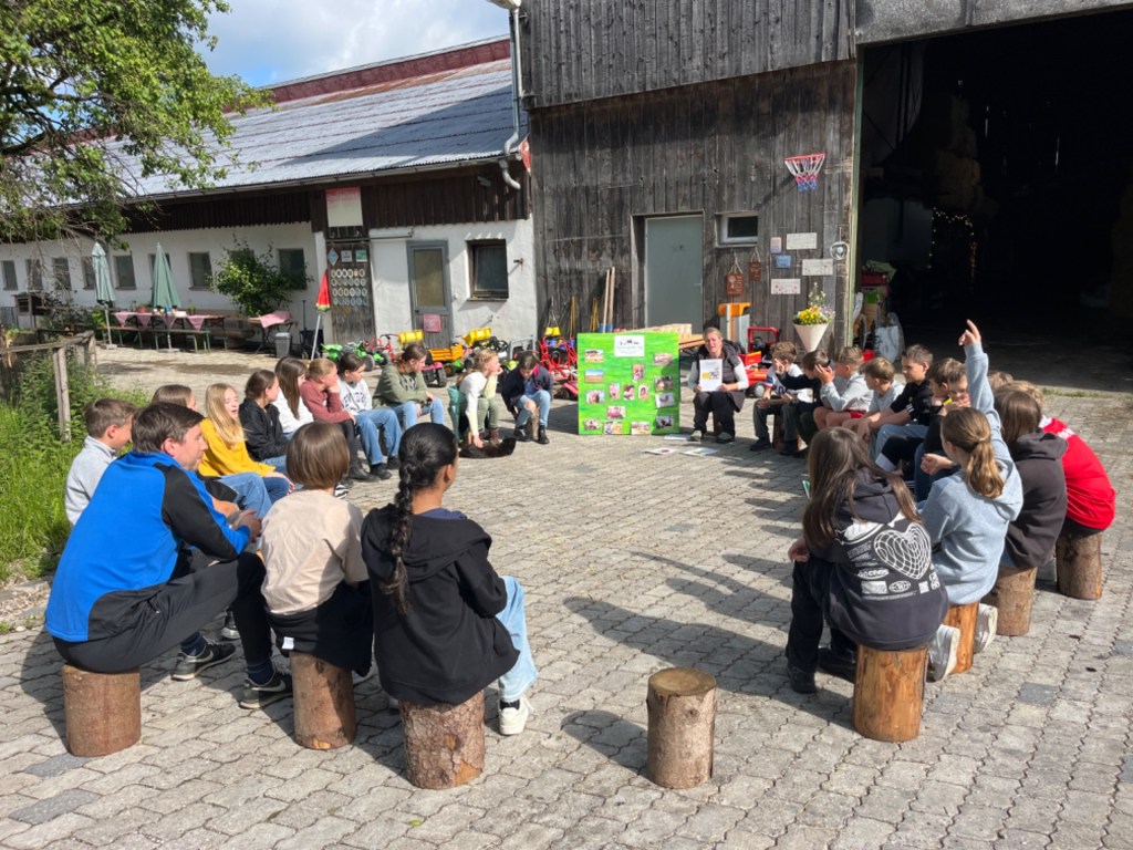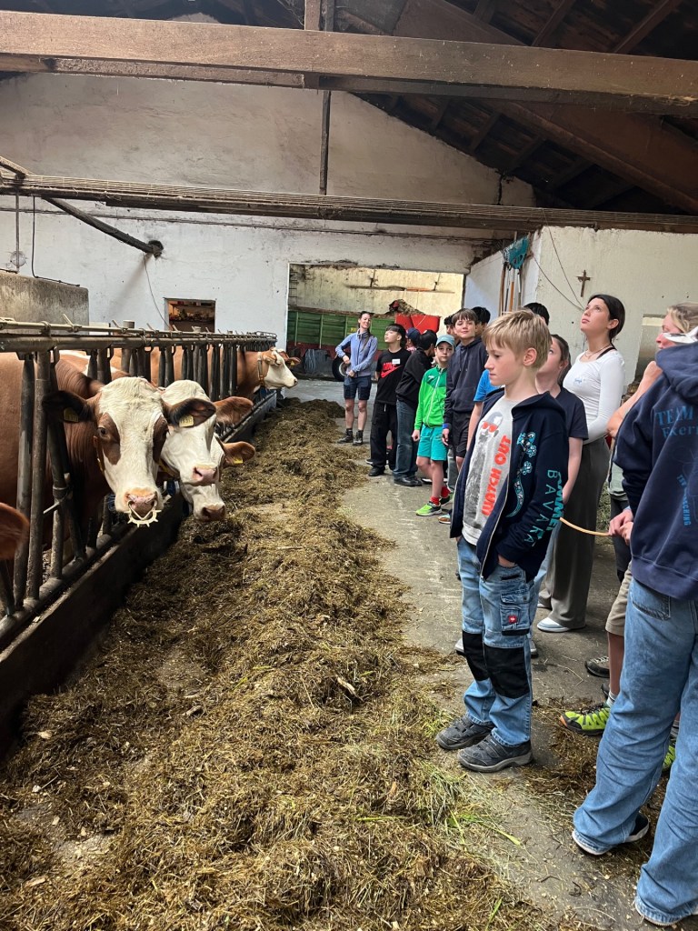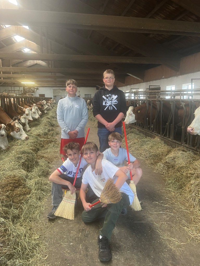 Am Dienstag, den 14.05.2024, sowie am 04.06.2024 besuchten die Schüler der Klassen 6B und 6C im Rahmen des Geographieunterrichts passend zum Lehrplanthema Landwirtschaft den Würmseefelder Hof in Machtlfing. Dort durften die jeweils 25 Schüler und Schülerinnen der beiden Klassen direkt bei der täglichen Arbeit mithelfen und erfuhren ganz nebenbei von der hofführenden Familie Ortner jede Menge Wissen über den landwirtschaftlichen Milchviehbetrieb, das Melken, die Fütterung der rund 70 Milchkühe und die Verarbeitung zu Lebensmitteln. Natürlich gab es auf dem Hof noch andere Tiere wie Hühner, Hasen, Katzen und Ziegen, welche zum Teil frei herumlaufen und gestreichelt werden durften.