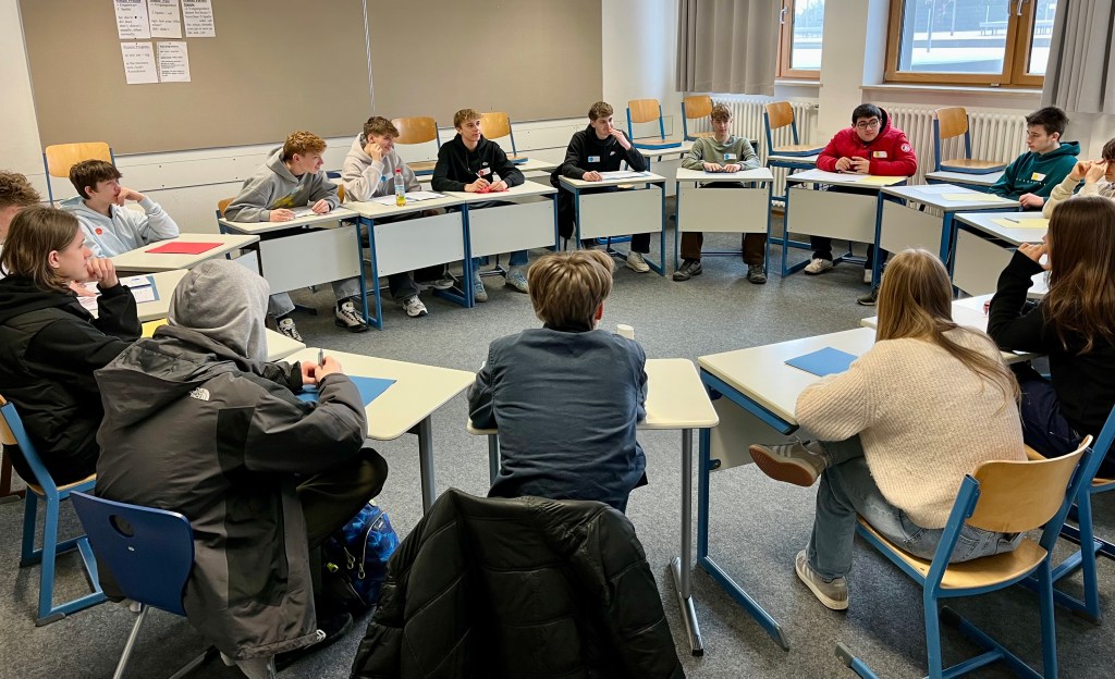 Bereits zu Beginn erhielten die Schüler ihre farbigen Mappen, die die vier Parteien repräsentierten: Blau für die Konservativen, Gelb für die Freien, Grün für die Ökologen und Rot für die Sozialen. In den Mappen fanden unsere jungen Politiker/-innen den Hinweis, z.B. als 62-jähriger Architekt aus Kulmbach zu agieren, sowie die Aufgabe, sich einen klangvollen Namen auszudenken. So entstand ein bunter Mix neuer Identitäten – wobei sich die Namensklassiker äußerster Beliebtheit erfreuten: zwei „Bauer“, drei „Mayer“, fünf „Müller“. Gleich neun Schülerinnen und Schüler gaben sich einen Doktortitel. Ein Schmunzeln war fast unvermeidlich, wenn man daran beobachtete, wie tief sie in ihre Rollen eintauchten und teils sogar gegen ihre eigene Überzeugung debattierten.