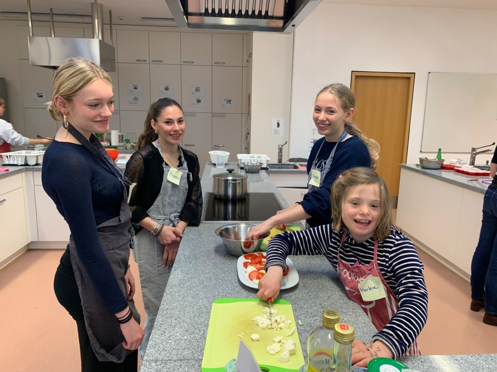 Gemeinsam schnippeln, rühren und genießen – unter diesem Motto fand am Donnerstag, den 27.03. ab 16.30 Uhr an der Realschule Herrsching ein ganz besonderes Koch-Event statt. Organisiert vom Inklusionsbeirat der Gemeinde Herrsching, versammelten sich Jugendliche im Alter von 10 bis 22 Jahren, darunter einige unserer Schülerinnen und Schüler, um zusammen mit Catherine ein köstliches französisches Drei-Gänge-Menü zu zaubern. Unterstützt wurden sie dabei von Frau Schwaiger und Frau Mäck-Tatz. Auf dem Menüplan stand zunächst eine feine Radieschencreme-Suppe, gefolgt von zweierlei Quiche – der klassischen Quiche Lorraine sowie einer südfranzösischen Tomatenquiche. Als süßen Abschluss gab es einen herrlich schokoladigen französischen Küchlein mit flüssigem Kern, begleitet von einem frischen Obstsalat. Neben dem kulinarischen Genuss stand vor allem das Miteinander im Mittelpunkt. Gemeinsam zu kochen, voneinander zu lernen und anschließend an einem großen Tisch die selbst zubereiteten Speisen zu genießen, machte allen Beteiligten große Freude. Der Austausch zwischen den Jugendlichen, das Teamwork in der Küche und das gemeinsame Essen sorgten für eine herzliche Atmosphäre, in der sich alle wohlfühlten. Das Fazit des Abends? Ein voller Erfolg! Alle waren sich einig: Dieses inklusive Kocherlebnis soll unbedingt wiederholt werden