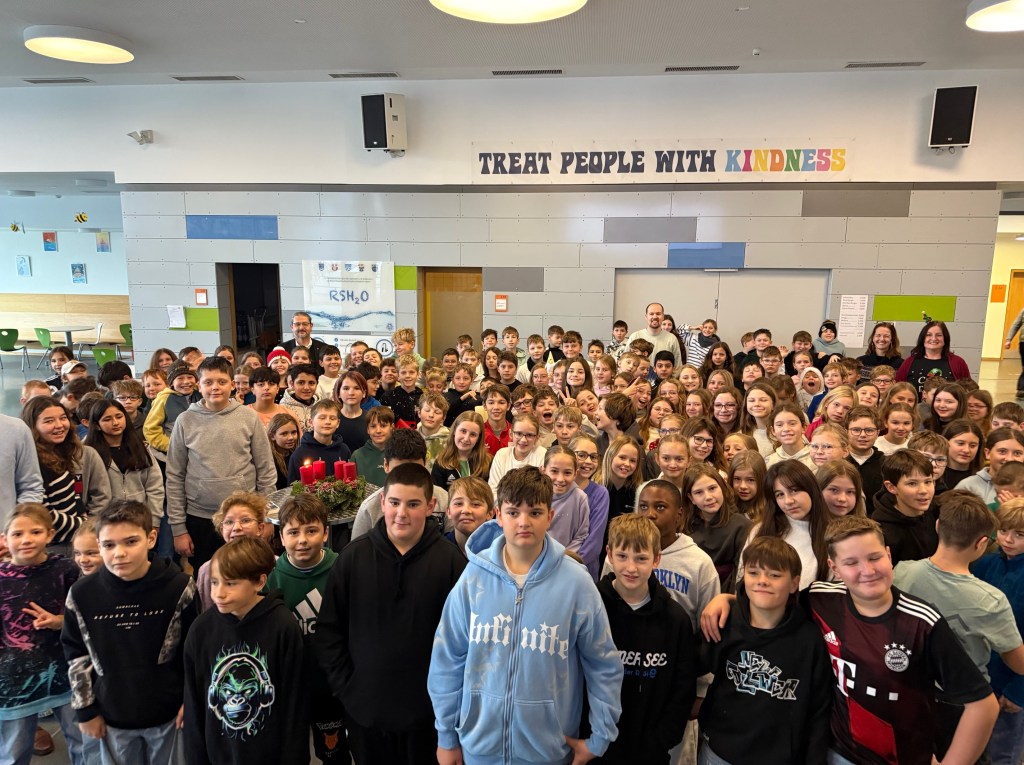 Die Schülerinnen und Schüler versammelten sich um den großen Adventskranz am Eingang der Schule. Nach einem besinnlichen Klaviervorspiel von Musiklehrerin Susanna Forstner begrüßte Pfarrer Simon Rapp alle herzlich. Es wurde die Lesung des vergangenen Sonntags vorgetragen, welche anschließend von Pfarrer Rapp gedeutet wurde. Welch großartige Vision des Propheten Jesaja: Alle Völker sind vereint im Frieden. Davon träumen so viele Menschen heute. Das Licht des Adventskranzes soll uns an diese Vision vom bleibenden Frieden erinnern und uns auffordern unser Tun danach auszurichten. Zum Abschluss sangen alle Schülerinnen und Schüler noch ein gemeinsames Lied.