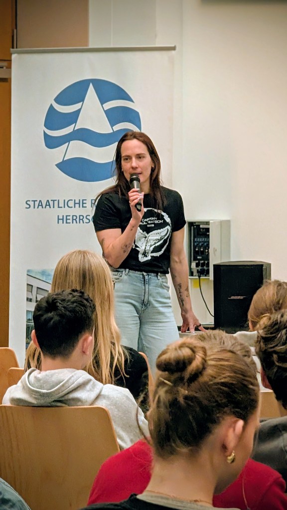 Der zweite Teil des Projekttages wurde gestaltet von der Captain Paul Watson Foundation Germany e.V. Die Stiftung – gegründet 2022 – setzt das Lebenswerk des international bekannten Meeresschützers Captain Paul Watson fort. Watson ist Mitbegründer von Greenpeace, Gründer der Sea Shepherd Conservation Society und seit über 50 Jahren aktiver Kämpfer gegen illegale Aktivitäten auf See.