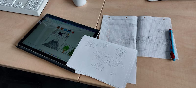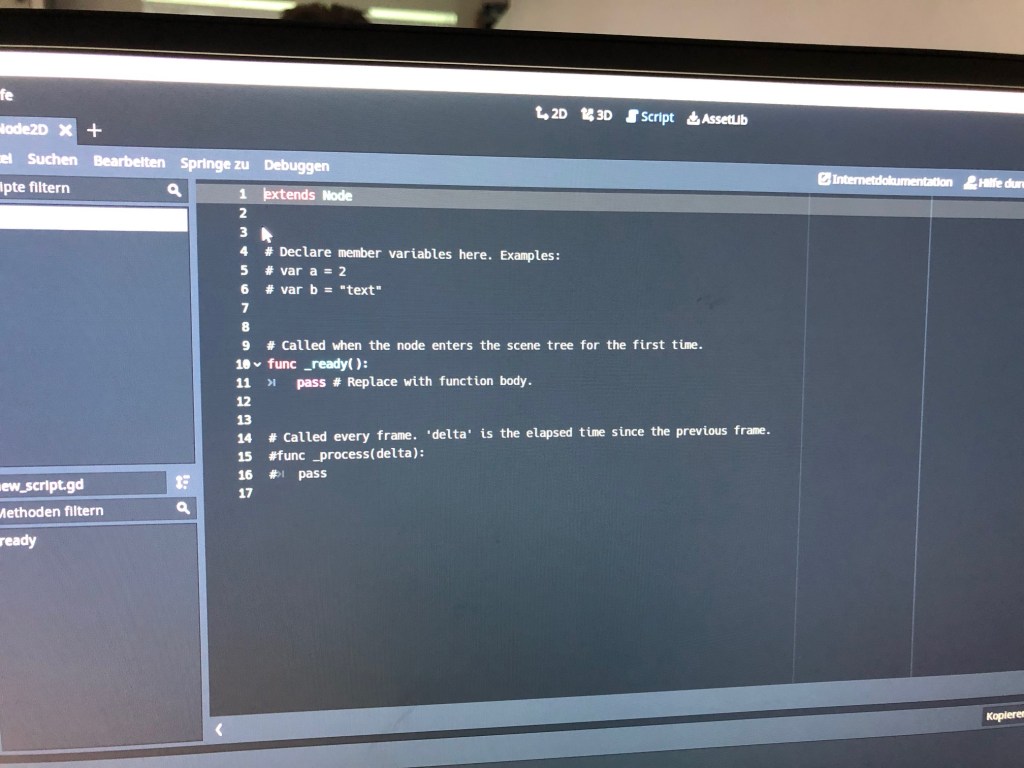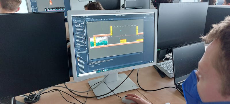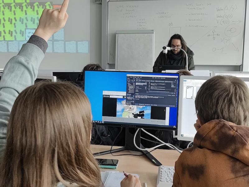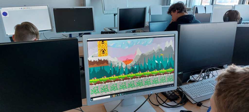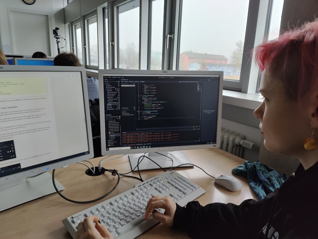 Der 2. Workshoptag war deutlich techniklastiger. Hier lernten die Schülerinnen und Schüler die Grundlagen im Umgang mit dem Programm Godot – ein Entwicklertool für Computerspiele. Es wurden bereits erste Funktionen programmiert, sodass sich die entworfenen Grafiken bewegen können.