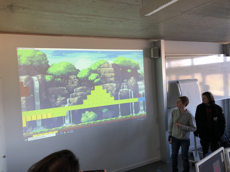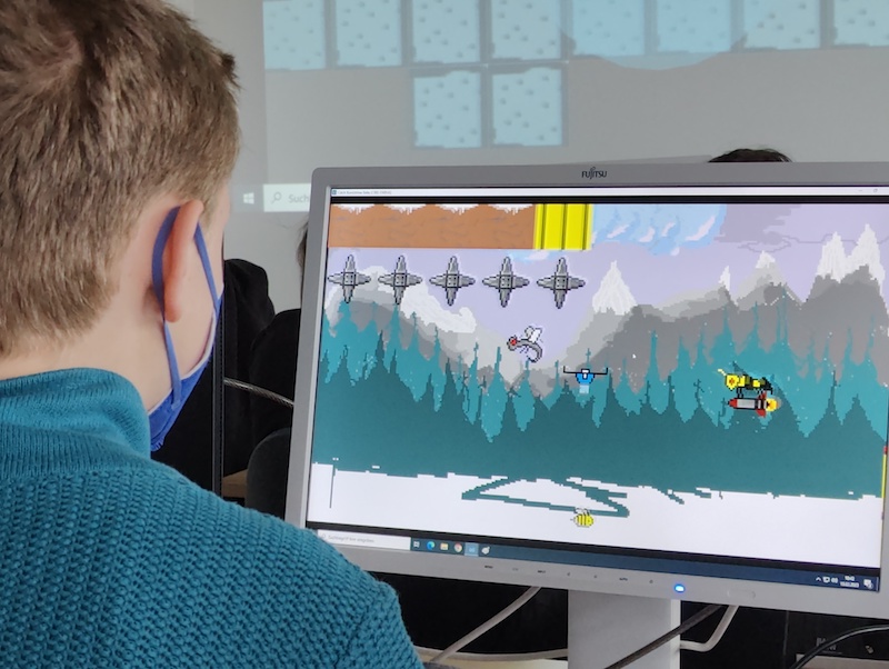 Dort startete sofort nach Ankunft der nächste Workshop: Die Godot-Grundlagen wurden wiederholt und vertieft. In Zweiergruppen haben alle Teilnehmerinnen und Teilnehmer in den folgenden drei Tagen fleißig Pixelart-Grafiken erstellt und Spielmechanismen programmiert. Das Ergebnis sind 10 funktionsfähige kleine Computerspiele. Die zufriedenen Teilnehmerinnen und Teilnehmer stellten ihre Spiele begeistert vor. Teilweise werden die Spiele – wieder zu Hause in Herrsching angekommen – auch noch verbessert und erweitert. Die Ergebnisse und das Gesamtprojekt werden wir zum Landeslehrpreis MINT-21digital einreichen. Da alle Beteiligten vom Projekt begeistert waren, hoffen wir darauf, es nächstes Schuljahr wiederholen zu können!