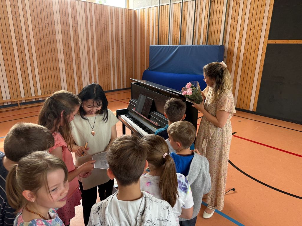 Die moderne Turnhalle, die erst im Oktober 2023 offiziell eingeweiht wurde, bot den perfekten Rahmen für das Konzert. Die Bühne war eindrucksvoll mit großen Papier-Gänseblümchen geschmückt, die das Frühlingsthema aufgriffen.